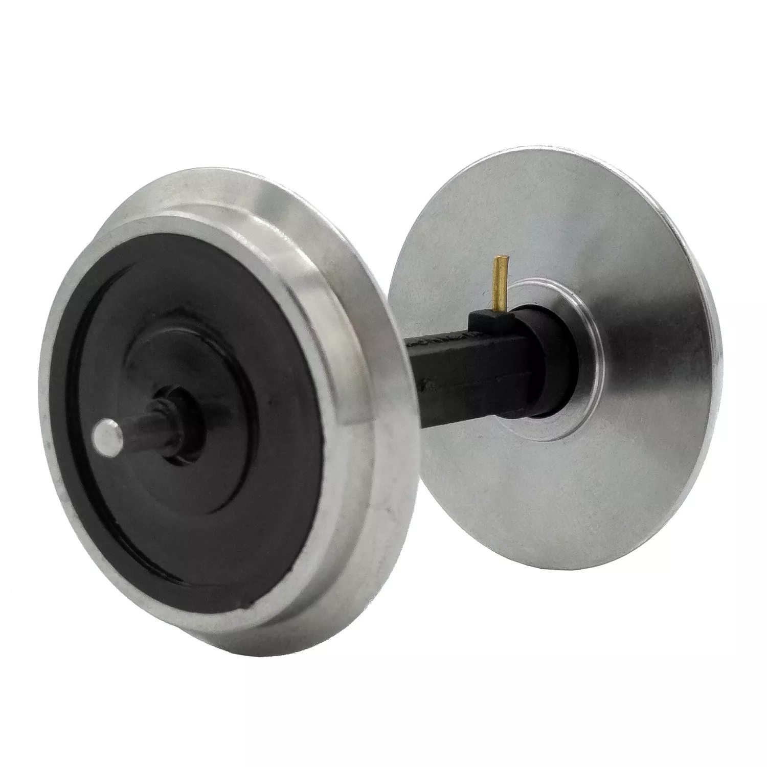 Die reibungsarme Rad-Achse besteht aus hochwertigem Edelstahl und verfügt über einen integrierten Stromabnehmer. Die Abmessungen entsprechen denen des Radsatzes Piko 36165.