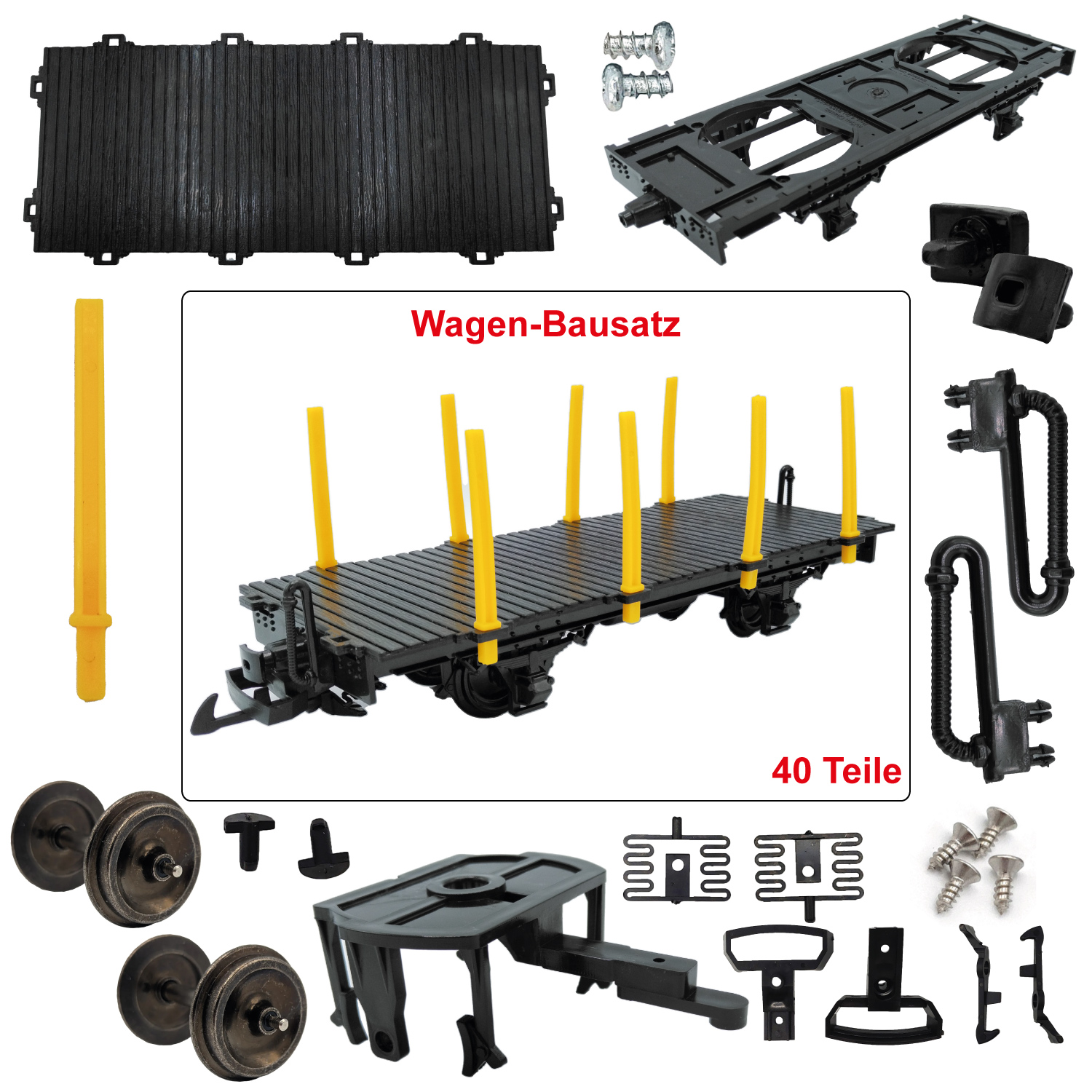Der Rungenwagen-Bausatz in schwarz mit gelben Rungen umfasst insgesamt 40 Einzelteile. Aufgrund der detaillierten Bauanleitung gestaltet sich der Zusammenbau als relativ unkompliziert.