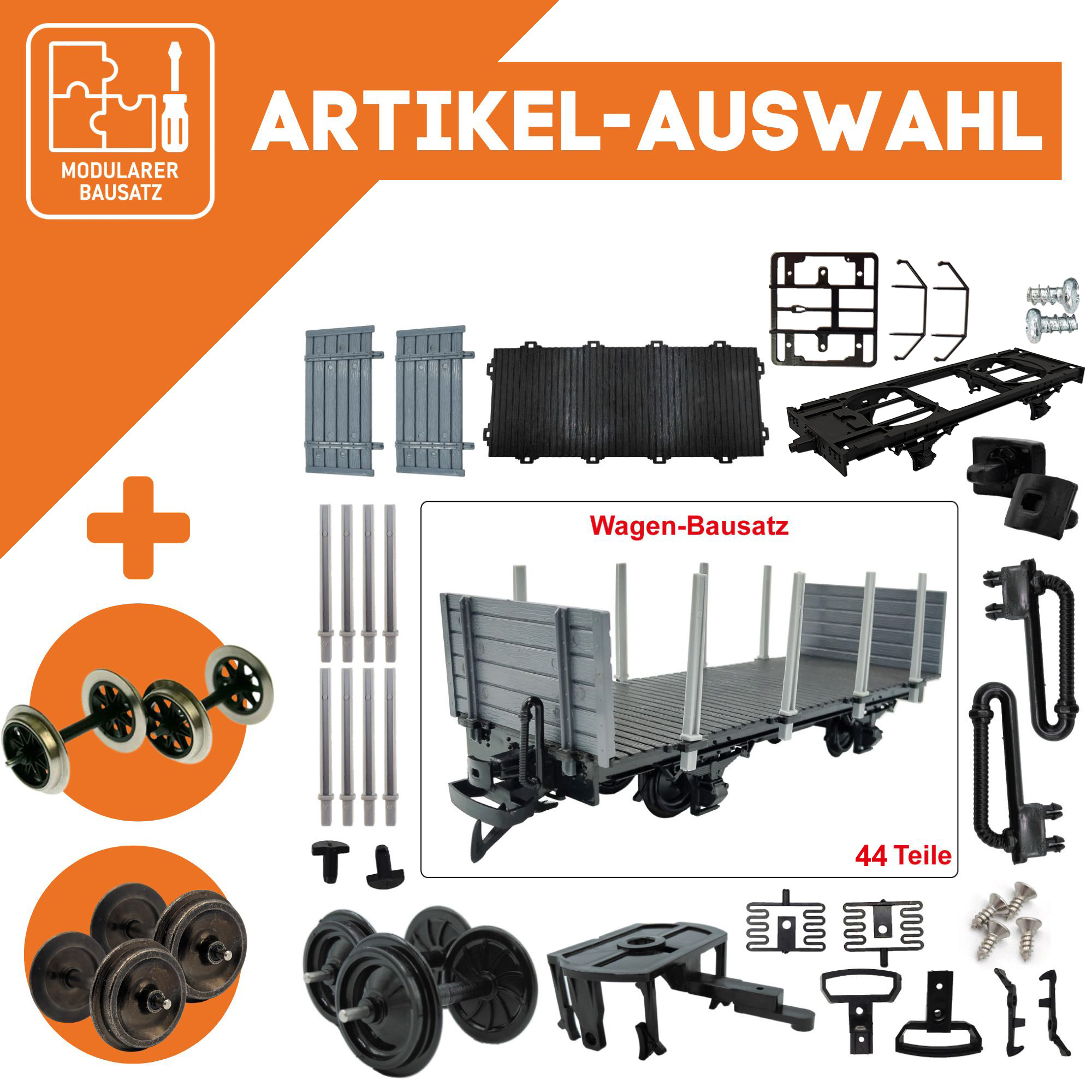 Der Rungenwagen mit Seitenwänden in Schwarz/Grau wird als präziser Spur-G Bausatz geliefert. Verwindungsarmer Plattformrahmen, steckbare Rungen und formstabile Seitenwände sowie passgenaue Steck-/Schraubverbindungen sorgen für zügige Montage und ruhige Laufeigenschaften im dauerhaften Anlagenbetrieb.