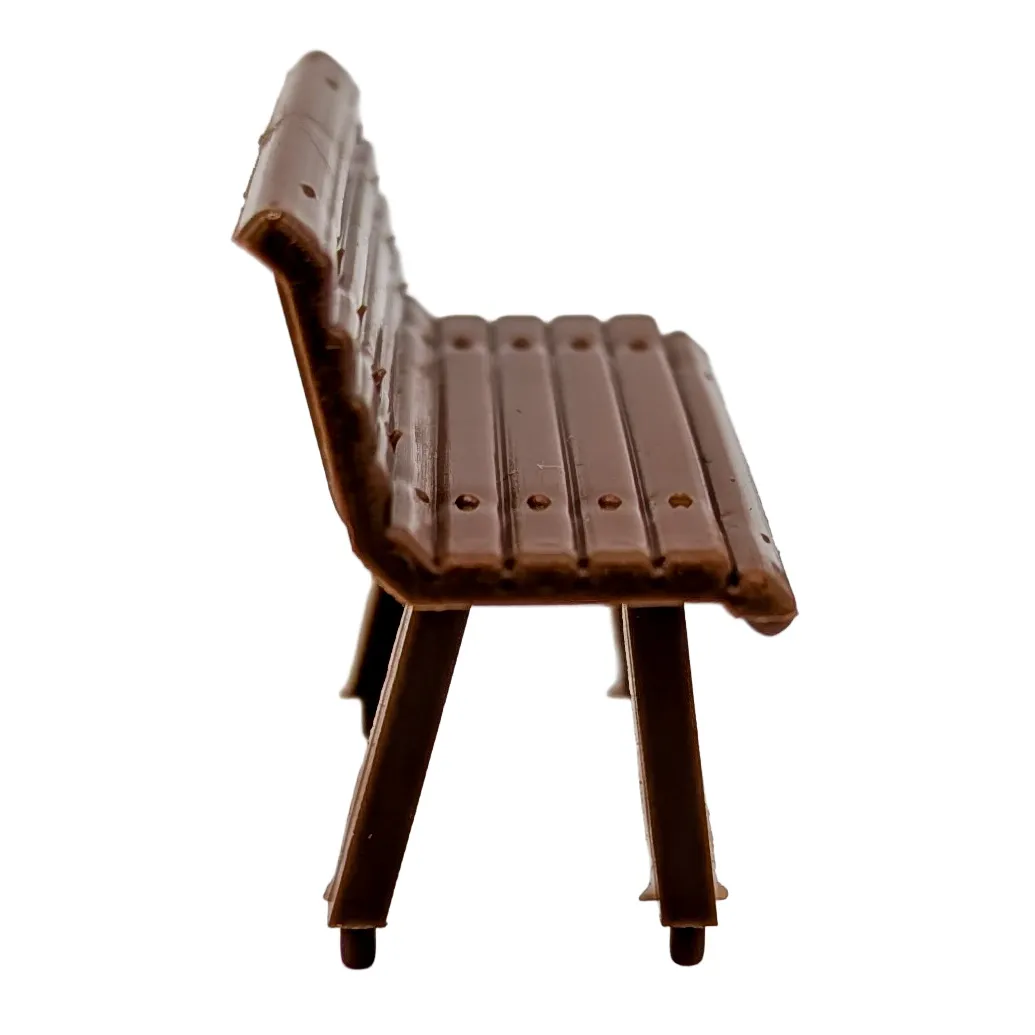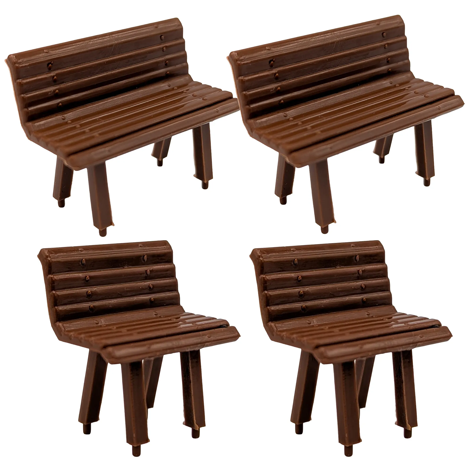 Dieses Set aus zwei kleinen und zwei großen Sitzbänken in Braun aus robustem Kunststoff bietet vielseitige Gestaltungsmöglichkeiten für Spur G Gartenbahnen und ist ideal für Wagen, Bahnhöfe und Dorfplätze.