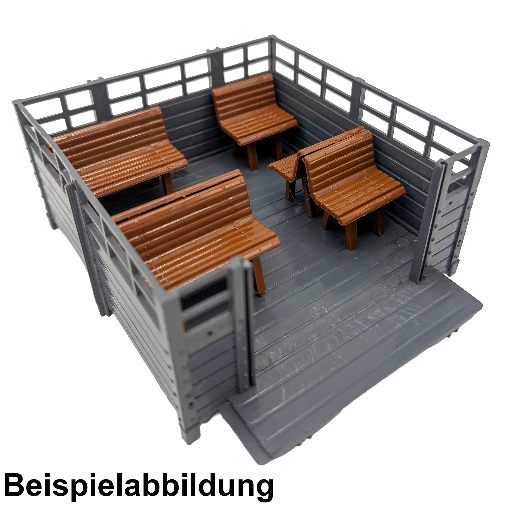 Im Set enthalten sind zwei kleine und zwei große Sitzbänke in Braun, gefertigt aus robustem Kunststoff und ideal für die Spur G Gartenbahn. Die kleinen Bänke messen L3 x B3,5 x H2,2 cm und die großen Bänke L4,5 x B3,5 x H2,2 cm. Diese Vielfalt macht sie perfekt für die Ausstattung von Wagen, Bahnhöfen, Dorfplätzen und Häusern. Sie bieten ausgezeichnete Flexibilität für den individuellen Anlagenbau und ermöglichen vielseitige Gestaltungsmöglichkeiten in verschiedenen Szenarien.