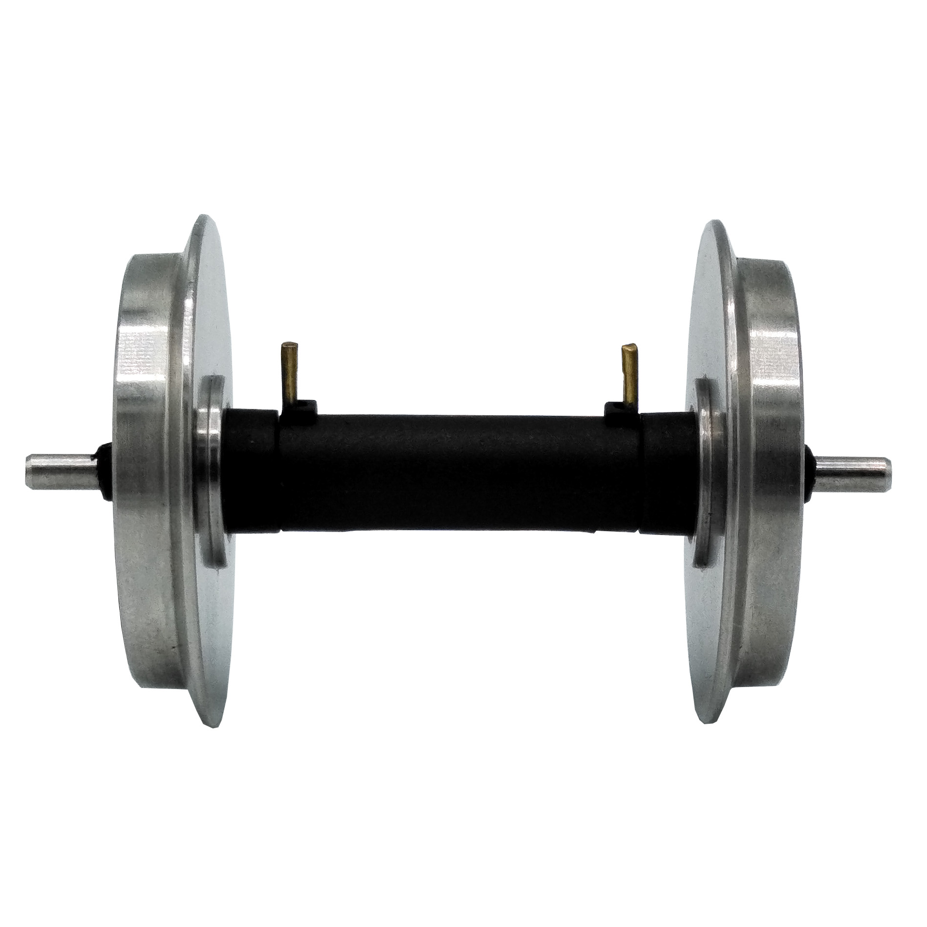 Die beiden reibungsarmen V-Speichen Radachsen aus Edelstahl sind jeweils mit einem integrierten Stromabnehmer ausgestattet. Der Durchmesser der Lauffläche beträgt 31 mm.