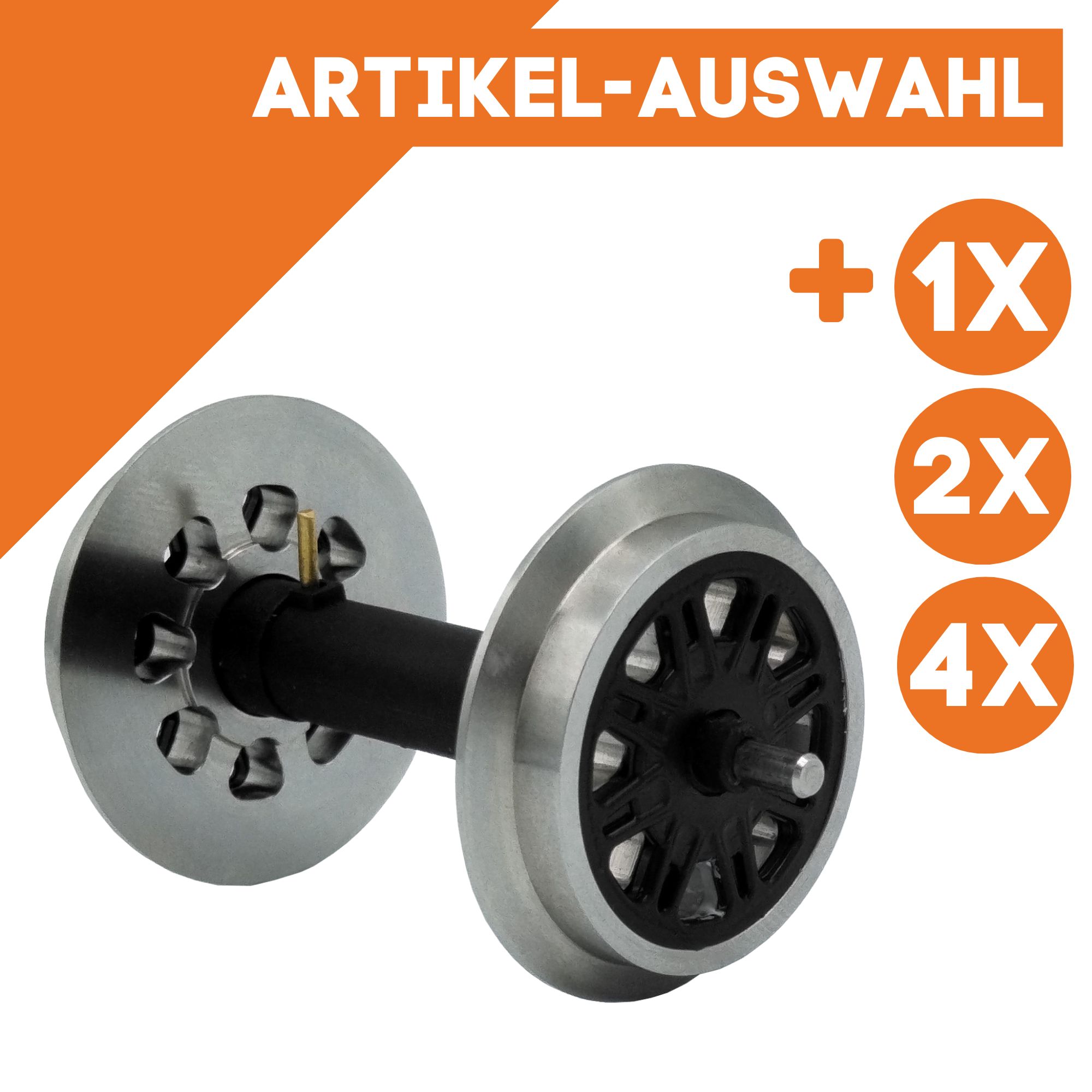 Material: Kunststoff/EdelstahlLaufflächen-Durchmesser: 31 mmRaddurchmesser: 37 mmSpurkranzhöhe: 3 mmAchslänge: 70,3 mmAchsdurchmesser: 7 mmAchsstummellänge: 6 mmAchsstummeldurchmesser: 3 mmStromaufnahmestifte jeweils: Ø 1,1 mm, Länge: 4,7 mmGewicht: 68 Gramm