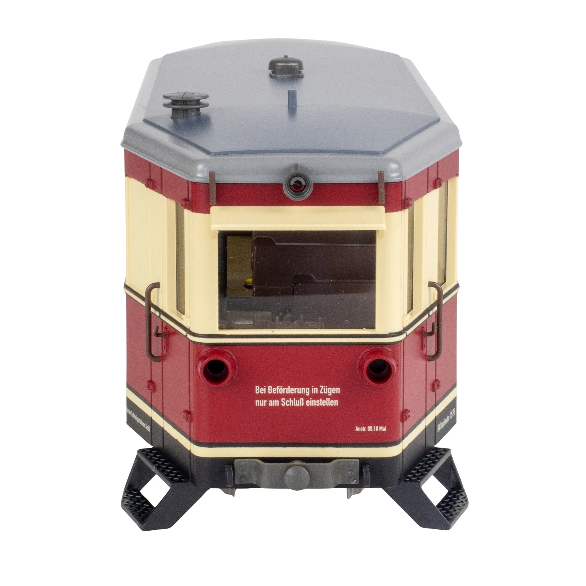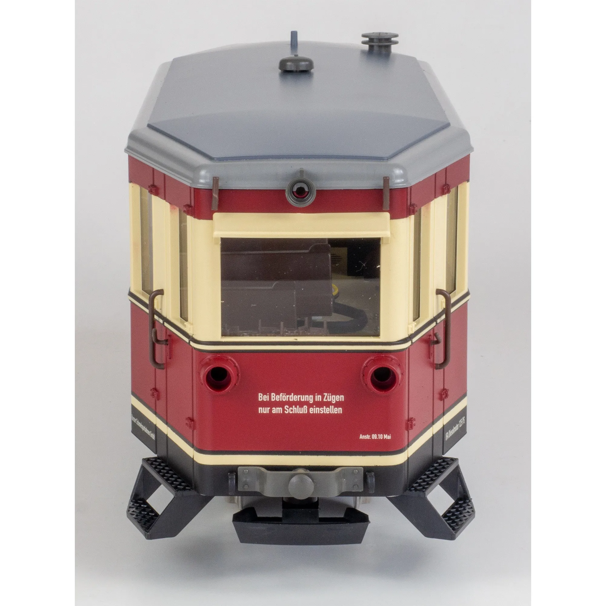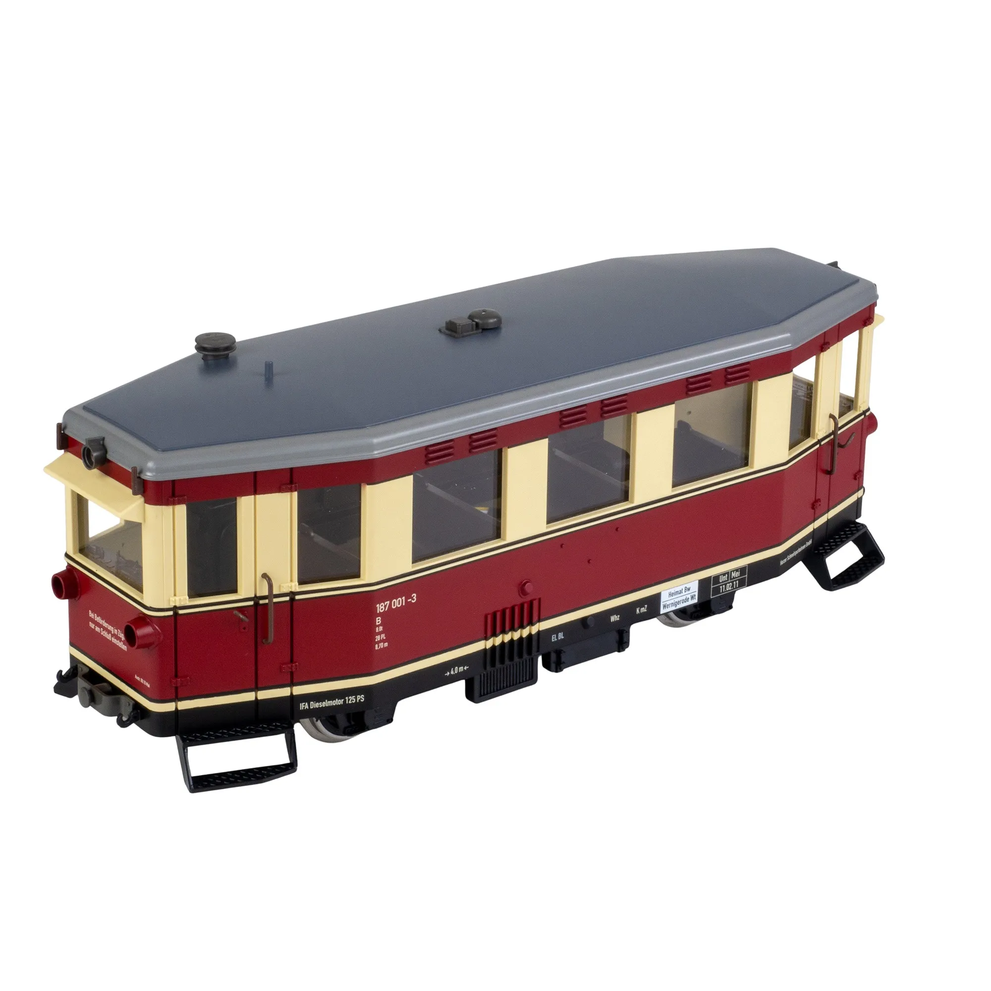 Das Vorbild wurde 1933 beschafft, erlebte nicht nur gute Zeiten und wurde 1989 neu aufgebaut. Seitdem wird es in sehr gutem Zustand für Sonderfahrten eingesetzt. Das Modell zeigt die aktuelle Lackierung in dunklem Rot mit vielen Zierstreifen und einer sauberen, detaillierten Bedruckung. Mit 45 mm Spurweite, 386 mm Länge über Puffer, Betriebsnummer 187 001 -3 sowie Digitalbetrieb (DCC) ist der Triebwagen vielseitig einsetzbar und zudem R1-tauglich.