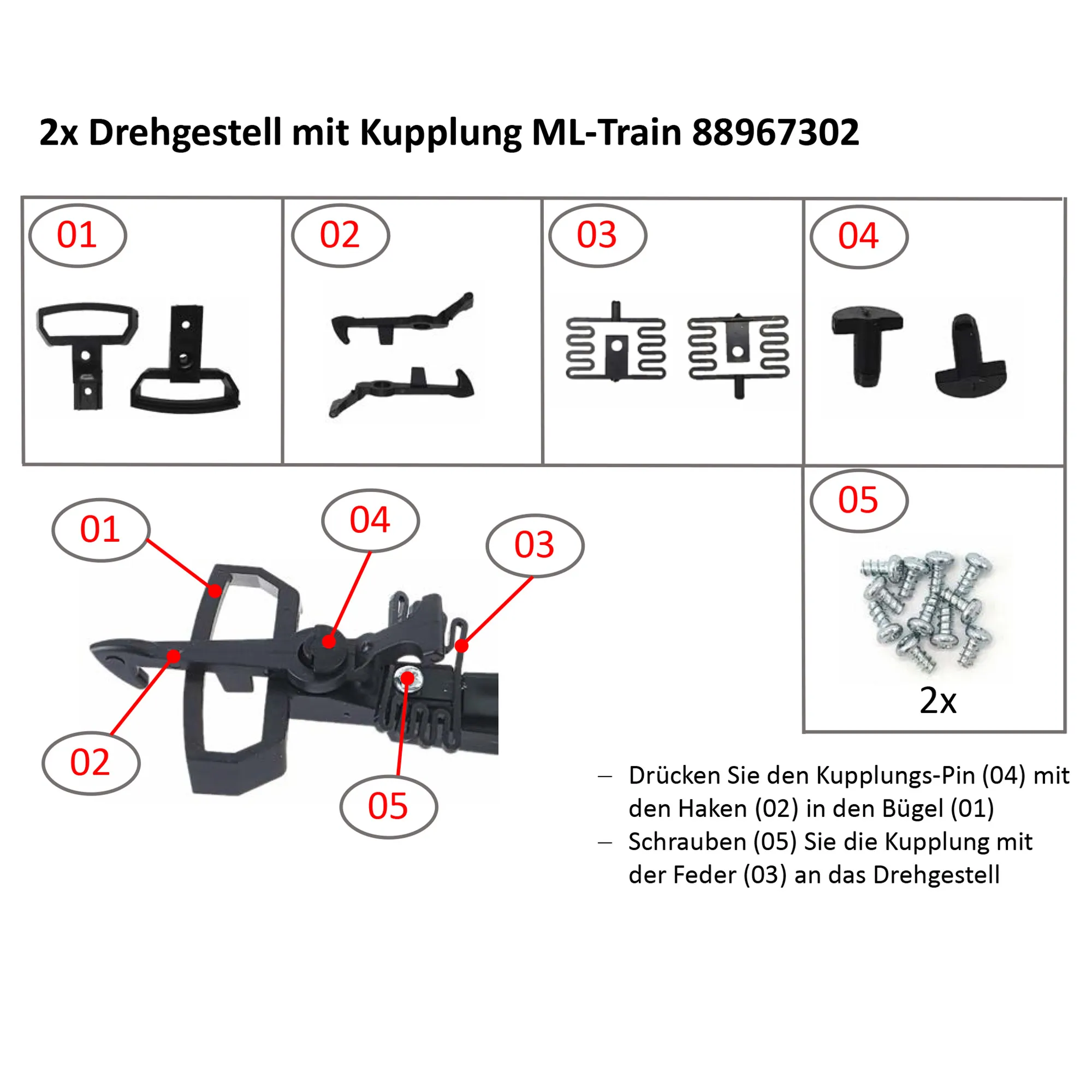 1x Fahrrahmen, 2x Drehgestell, 2x Kupplung, 2x Schrauben