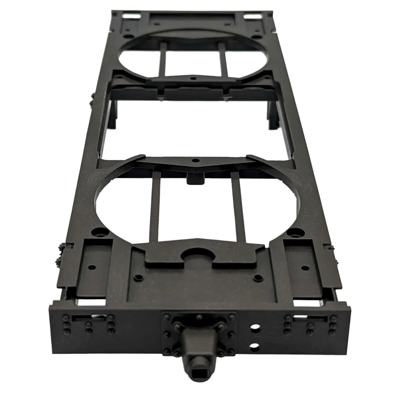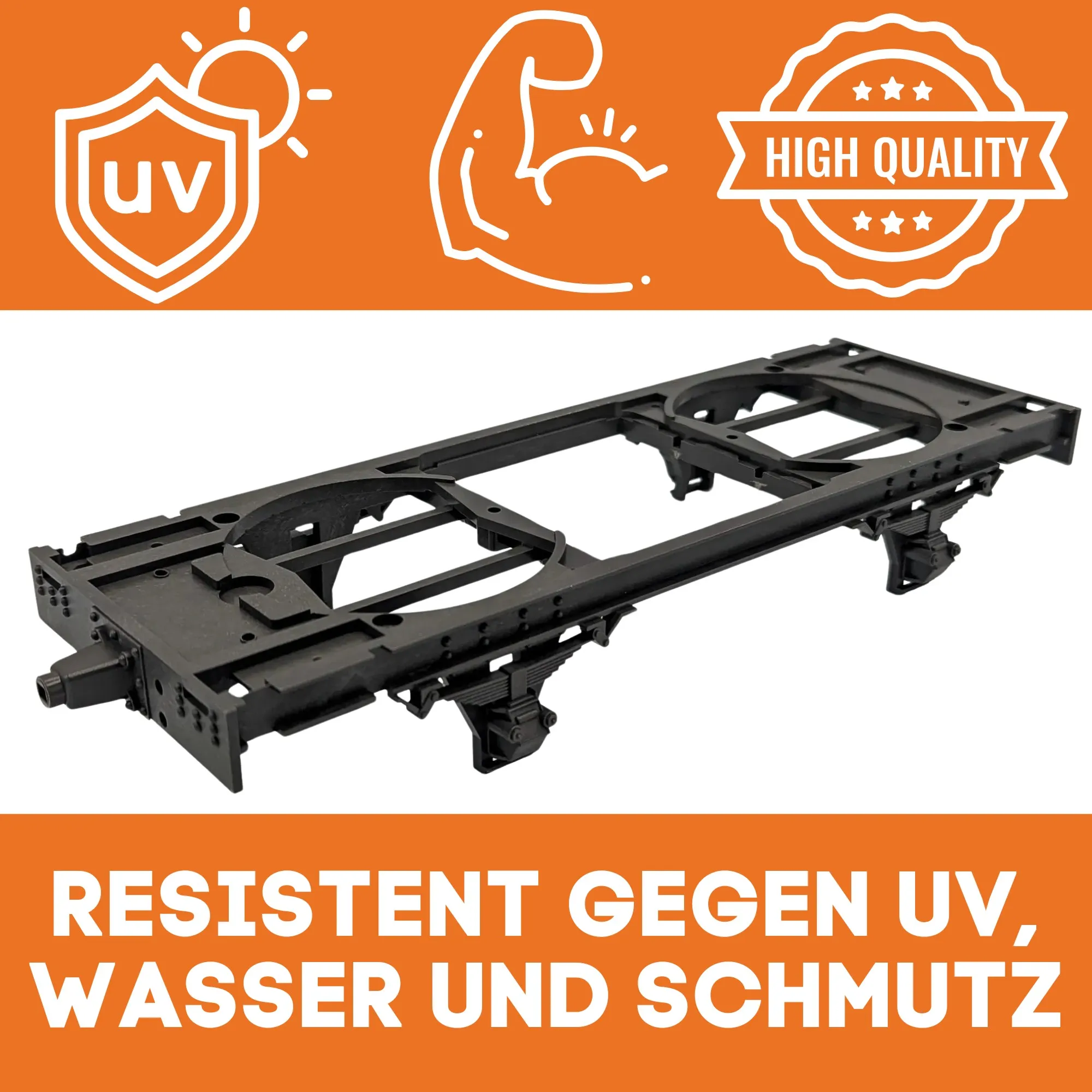 Gefertigt aus hochwertigem Polyamid mit Glaskugelverstärkung, überzeugt der Fahrrahmen durch ausgezeichnete Formstabilität, hohe mechanische Belastbarkeit und präzise Maßhaltigkeit. Das Material bietet gegenüber herkömmlichem Kunststoff eine verbesserte Wärmeformbeständigkeit, reduziert Verzug und erhöht die Lebensdauer – ideal für den dauerhaften Einsatz auf der Gartenbahn im Außenbereich. Auch bei direkter Sonneneinstrahlung oder wechselnden Witterungsbedingungen bleibt der Rahmen formtreu und belastbar.