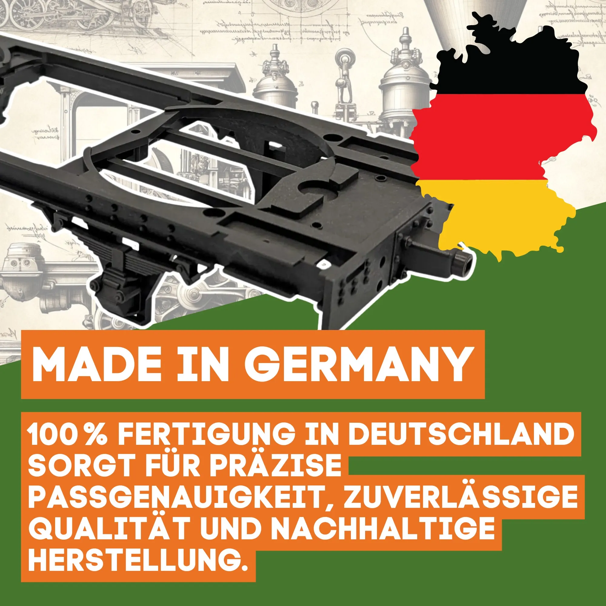 Die Produktion erfolgt zu 100 % in Deutschland – unter Einhaltung strenger Qualitätsstandards und mit besonderem Fokus auf Passgenauigkeit, Oberflächenhärte und Langlebigkeit.