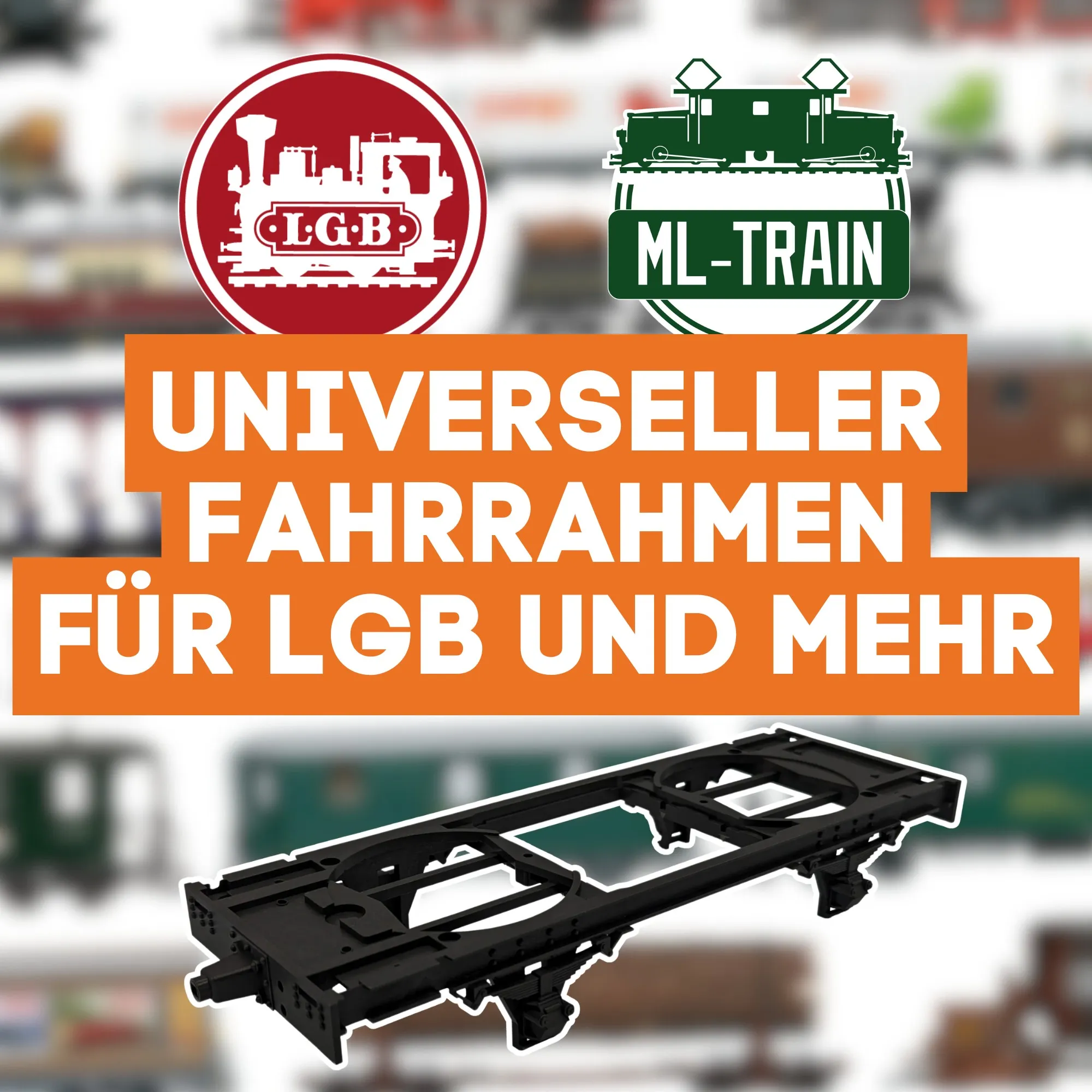 Der Universal Fahrrahmen ist eine hochwertige Ersatzkomponente zur Reparatur oder zum Umbau von Modellen der Spur G. Mit seiner Länge über Puffer von 30 cm eignet sich der Rahmen ideal für diverse Personen- und Güterwagen der Spur G von den Firmen LGB (Märklin) und ML-Train.