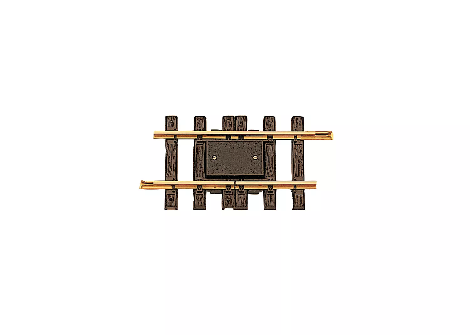 Bei diesem Gleis ist eine Schiene unterbrochen. Dieses Gleis wird oft für isolierte Halteblöcke vor Signalen verwendet. Eine verdeckte Kabelklemme erleichtert den Anschluß. Länge: 150 mm.