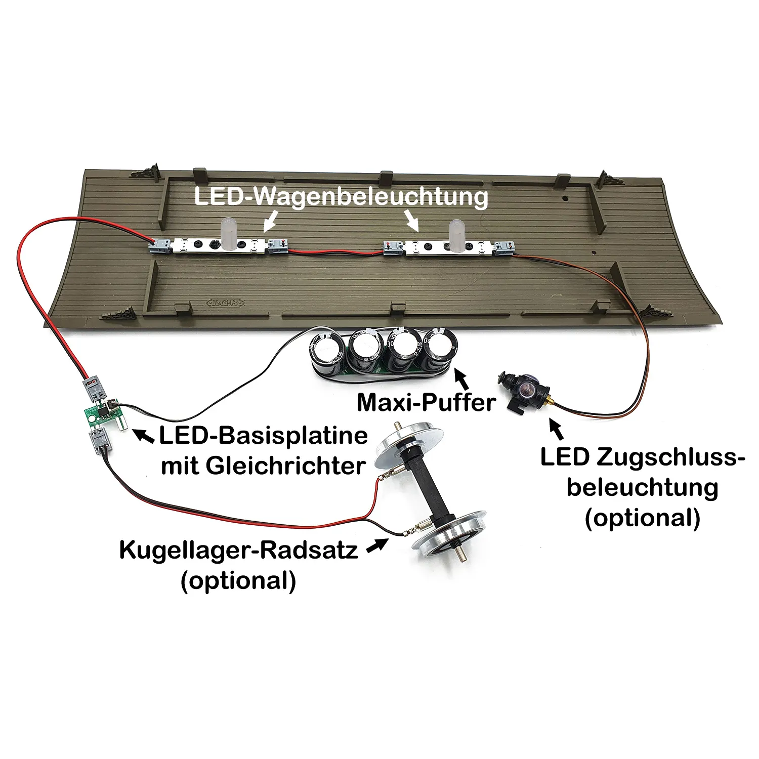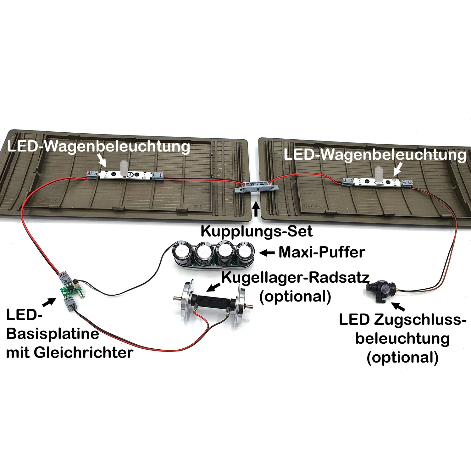 Das Beleuchtungs-System können Sie mit den folgenden Bauteilen weiter ausbauen bzw. ergänzenLED Beleuchtungs-Set für kurze und lange Wagen ML-Train 83801001LED-Basisplatine mit Gleichrichter und Pufferanschluss ML-Train 83801002Kupplungs-Set für die Spur-G Wagenbeleuchtung ML-Train 838010032x LED-Wagenbeleuchtung warmweiß 7-24 V ML-Train 83802019LED Zugschlussbeleuchtung warmweiß 7-24 V ML-Train 83801006Maxi Puffer (27200 µF) für Lichtleisten ML-Train 88201015Kugelgelagertes Radsatzpaar 2 Stück LGB 674034 Stück Flachstecker-Verbinder 2-polig ML-Train 852010194 Stück Randverbinder-Stecker 2-polig ML-Train 85201021Flachstecker 2 polig 2 Stück ML-Train 85201003Kabel für Kugellagerradsatz mit Randverbinder-Stecker ML-Train 85101062Verbindungskabel für Lichtleisten ML-Train 85101063