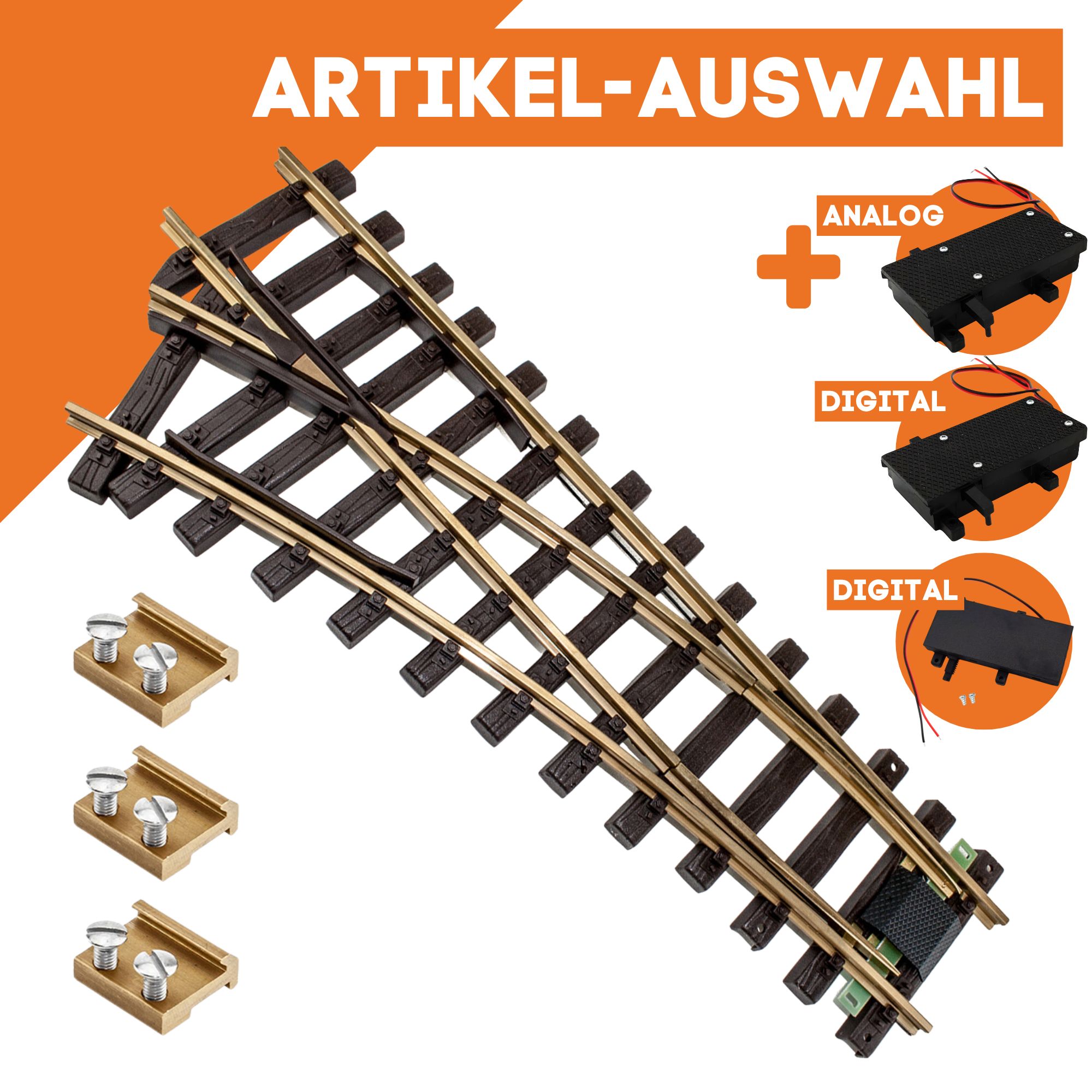 Links abzweigende Messingweiche mit Radius 90 cm für langlebigen Einsatz auf Innen- und Außenanlagen. Messingprofile sichern verlässliche Stromübertragung, präzise Zungenauflage und definierte Übergänge fördern ruhiges, ruckarmes Rollen. Die beiliegenden Verbinder erzeugen mechanisch feste, elektrisch leitfähige Stoßstellen und halten den Fahrstrom stabil. Einheitliche Maße erleichtern Austausch, Erweiterung und Pflege, sodass Züge auch bei Schleichfahrt sauber durch den 90-cm-Abzweig laufen.