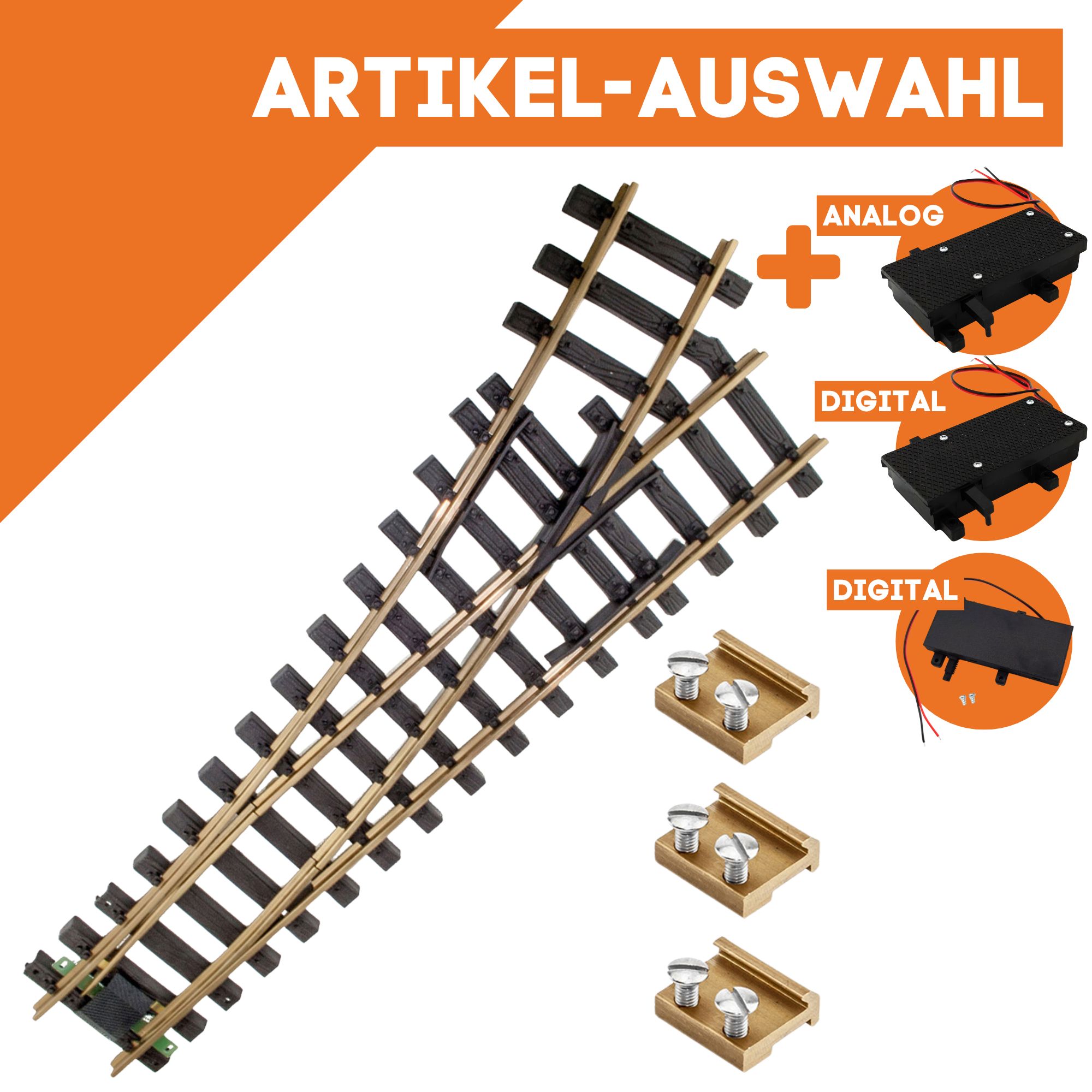 Links ausgeführte Weiche aus Messing für dauerhaften Betrieb auf Innen- und Außenanlagen. Das Material bietet zuverlässige Stromübertragung und widersteht Witterungseinflüssen, zugleich bleiben Profil und Spurführung präzise. Mitgelieferte Verbinder stellen mechanisch feste, elektrisch leitfähige Übergänge her, sodass der Fahrstrom stabil bleibt. Einheitliche Abmessungen erleichtern Planung, Nachrüstung und Austausch identischer Teile im Bestand. Die Weiche unterstützt ruhiges Rollen über das Herzstück, mindert Kontaktunterbrechungen und fördert einen gleichmäßigen Fahrfluss – vom Rangiergang bis zur langen Zugfahrt.