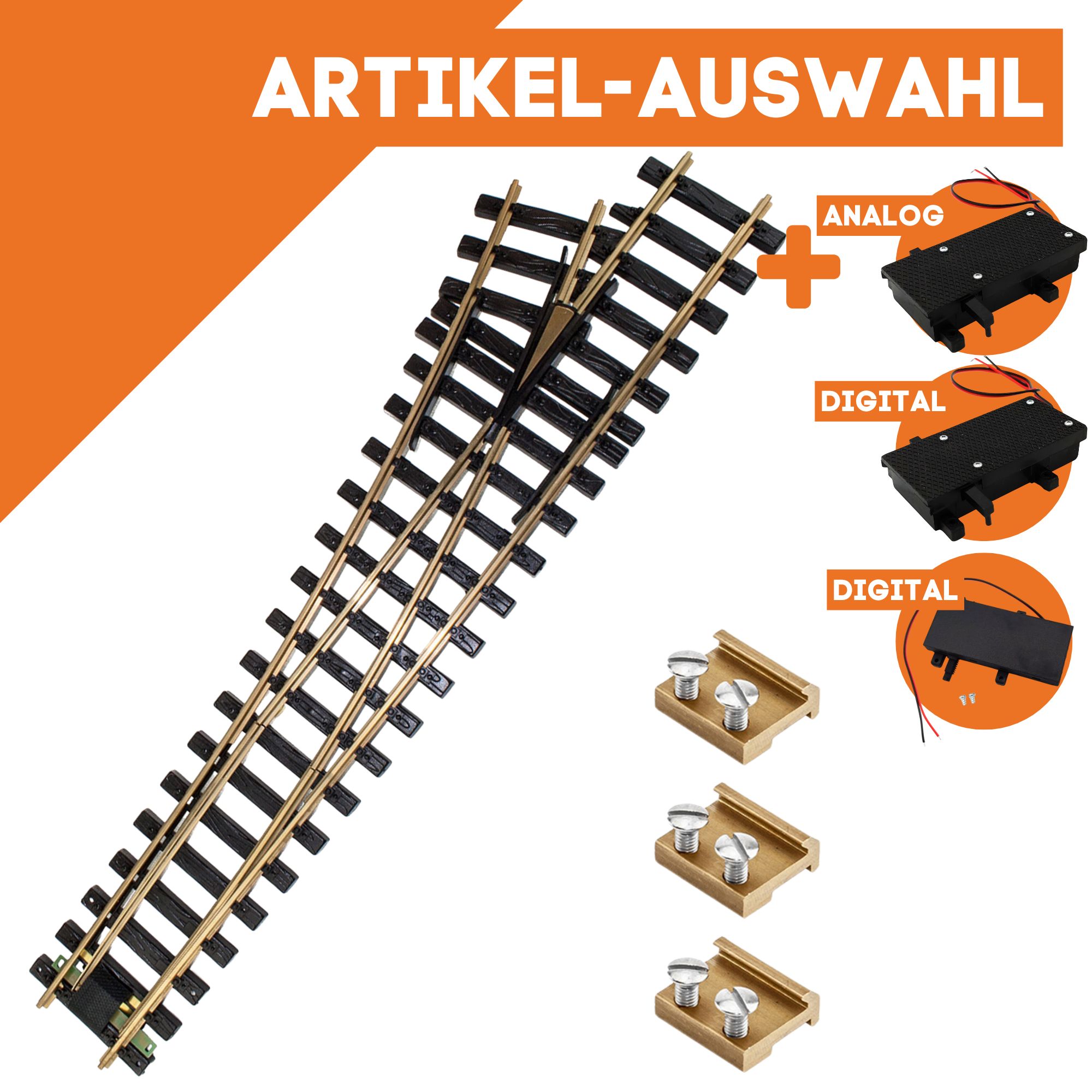 Links abzweigende Messingweiche im Radius R5 210 cm für langlebigen Einsatz auf Innen- und Außenanlagen. Messingprofile gewährleisten eine stabile Stromübertragung, präzise Zungenauflagen und definierte Übergänge fördern ruhiges Rollen. Die beiliegenden Verbinder stellen mechanisch feste, elektrisch leitfähige Anschlüsse her und halten den Fahrstrom über die Stoßstellen hinweg konstant. Einheitliche Maße erleichtern Austausch, Erweiterung und Pflege, sodass der Betrieb planbar bleibt und Züge auch bei niedriger Geschwindigkeit sauber durch den Abzweig laufen.