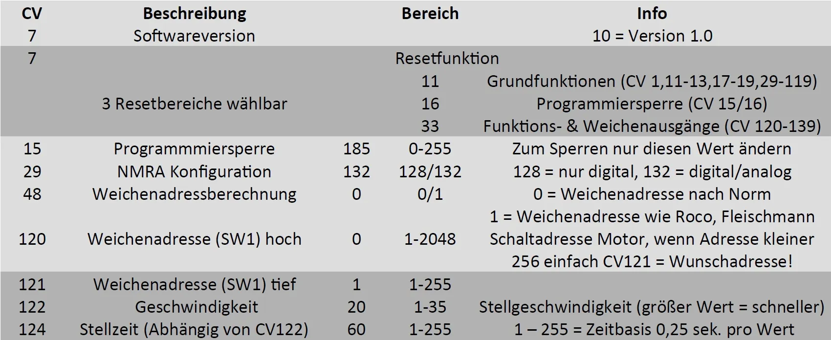 CV-Werte lassen sich per POM oder direkt programmieren. Programmiersperre über CV 15/16 inklusive. Die Adresse wird über CV 120/121 konfiguriert.