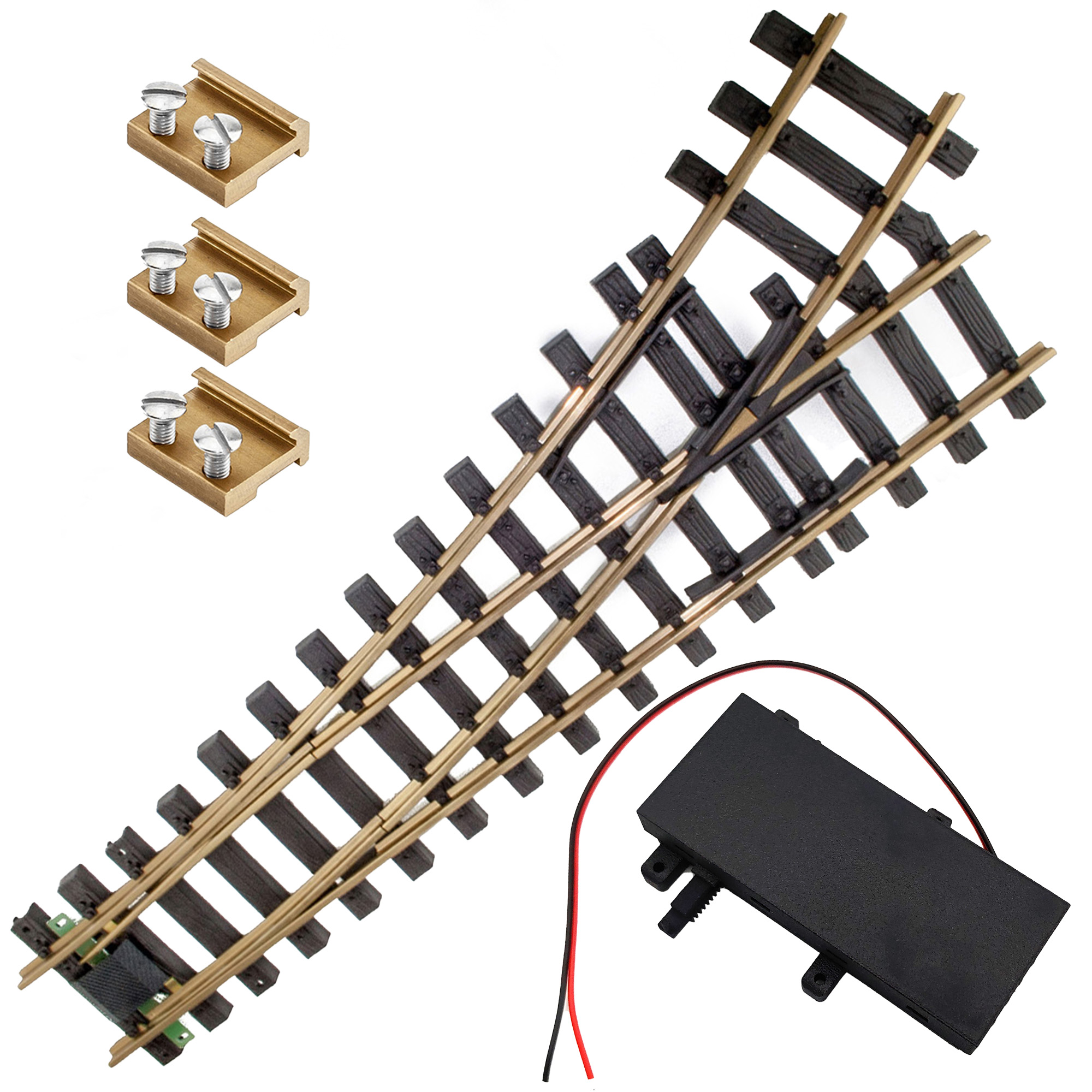 Set mit linker Messing-Weiche (R3 / 120 cm) inklusive 3 Schraubverbindern sowie digitalem TL-Weichenantrieb mit wetterfestem Gehäuse, präziser Stellmechanik und CV-Programmierung. Kompatibel mit allen Spur-G-Systemen.