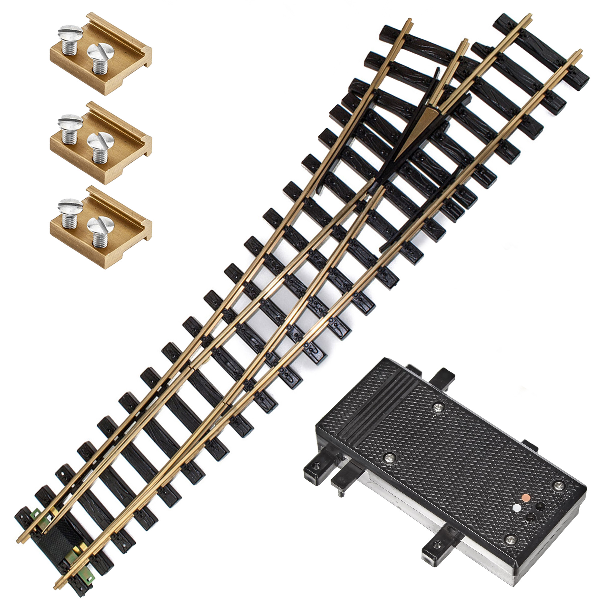 Set mit linker Messing-Weiche (R5 / 210 cm) inklusive 3 Schraubverbindern sowie klassischem Weichenantrieb LGB 12010 für analogen Betrieb. Ideal zur Verwendung mit LGB-Stellpulten und Automatisierungszubehör auf großen Spur-G-Anlagen.
