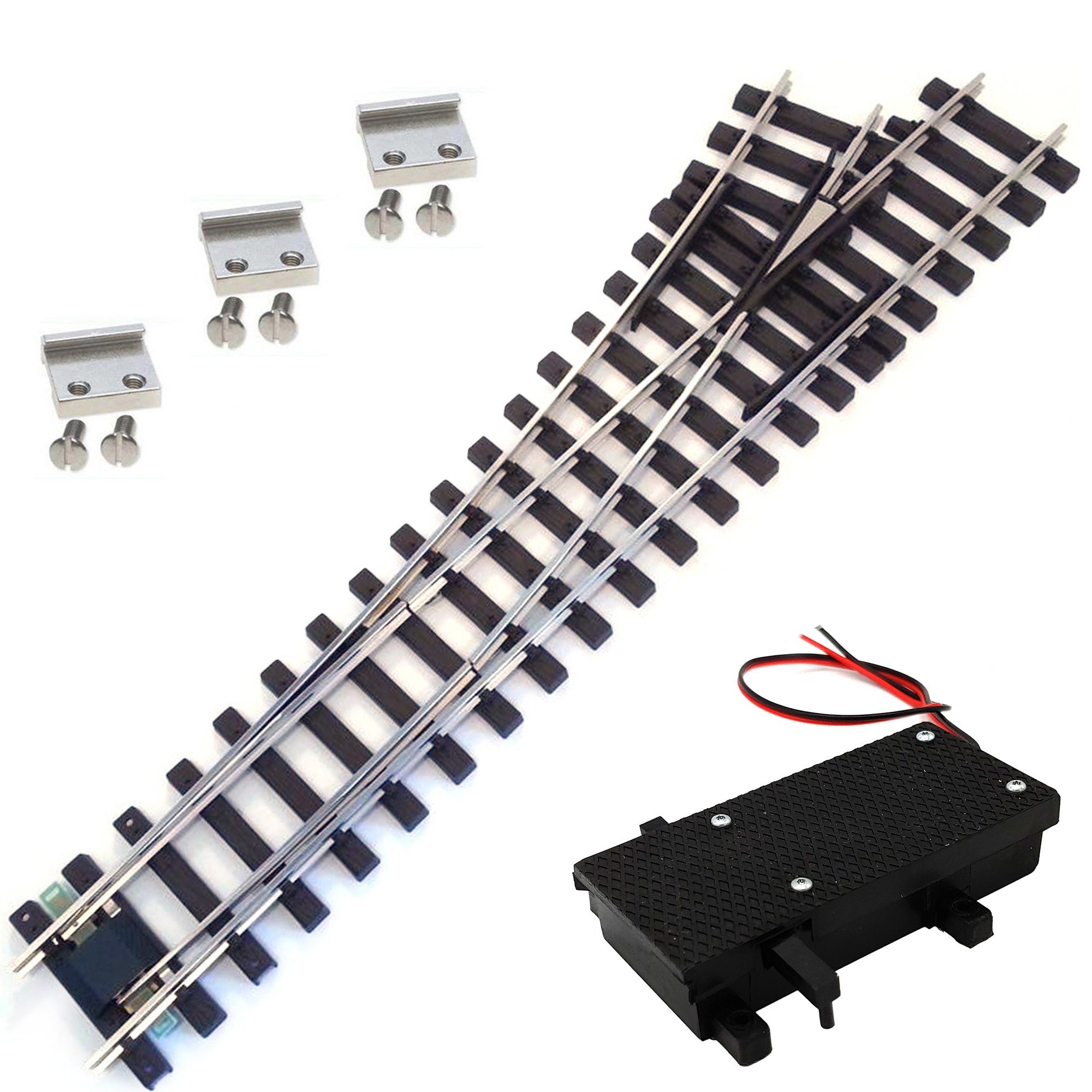 Set mit linker vernickelter Weiche (R 210 cm) inklusive 3 Schraubverbindern sowie wetterfestem Weichenantrieb mit Herzstückrelais und kräftigem Metallgetriebemotor. Ideal für besonders großflächige Spur-G-Außenanlagen.
