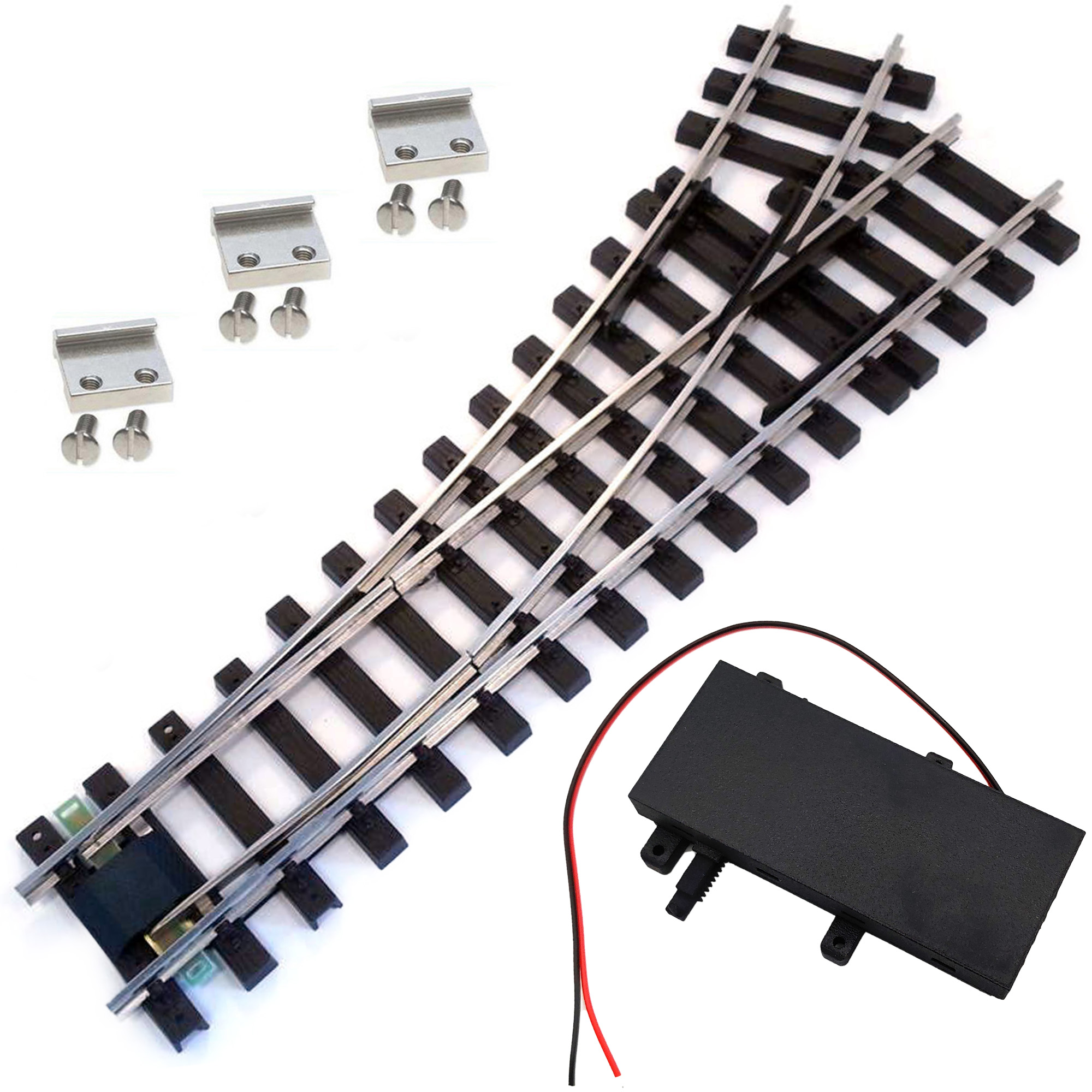 Set mit linker vernickelter Weiche (R 120 cm) inklusive 3 Schraubverbindern sowie digitalem TL-Weichenantrieb ML-Train 84020002 mit geschlossener Bauform, präzisem Metallgetriebemotor und CV-programmierbarer Stellgeschwindigkeit.