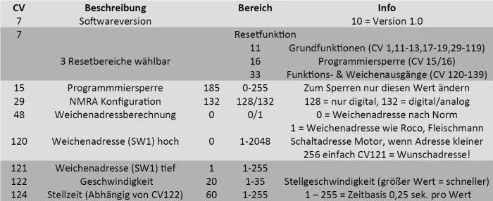 CV-Register, bitweise Einstellungen, POM und Programmiersperre über CV 15/16. Kein zusätzlicher Programmierwiderstand notwendig. Programmierung ohne Einfluss auf andere Decoder möglich.