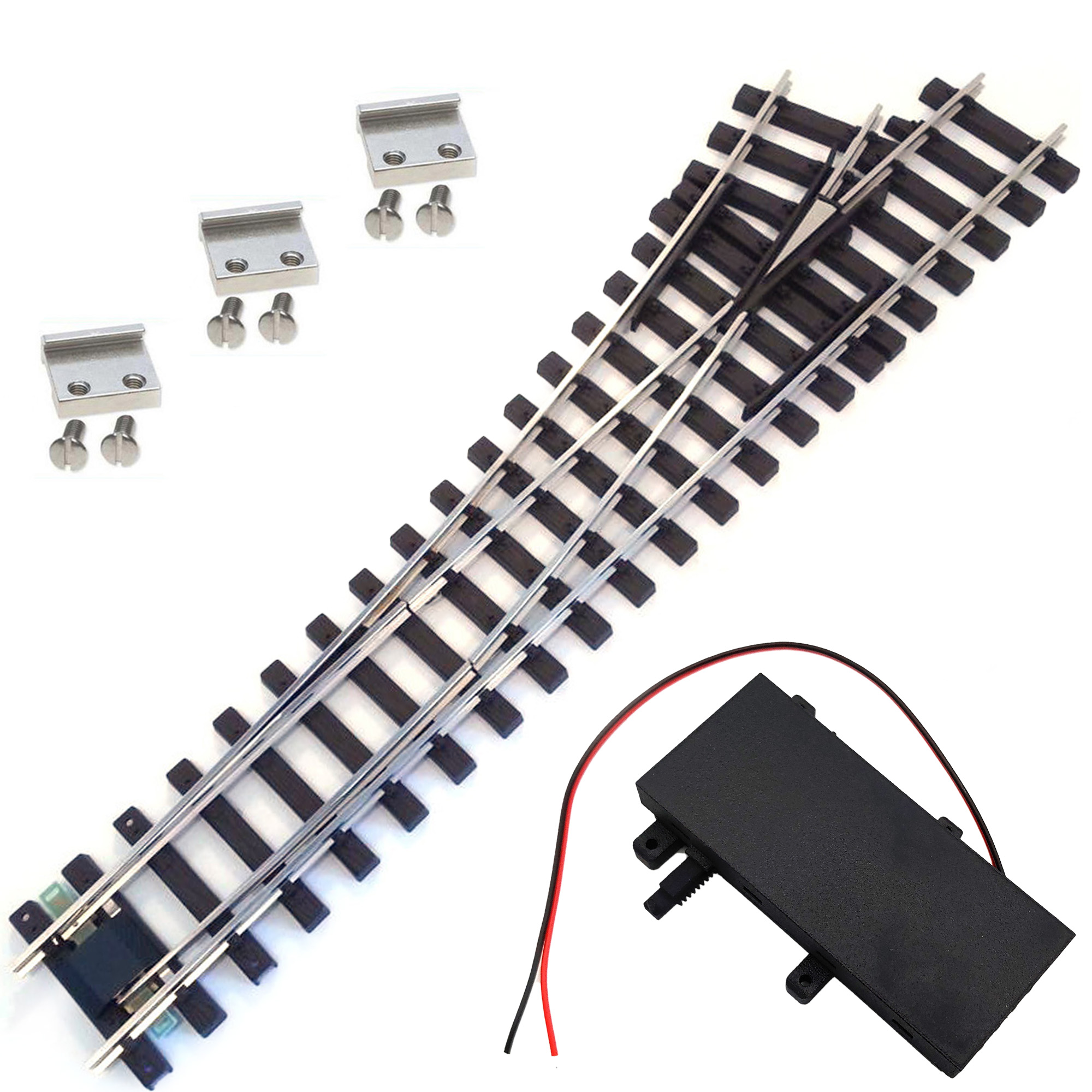 Set mit linker vernickelter Weiche (R 210 cm) inklusive 3 Schraubverbindern sowie digitalem TL-Weichenantrieb ML-Train 84020002 mit wetterfestem Gehäuse, CV-programmierbarer Stellzeit und kraftvollem Metallgetriebemotor.