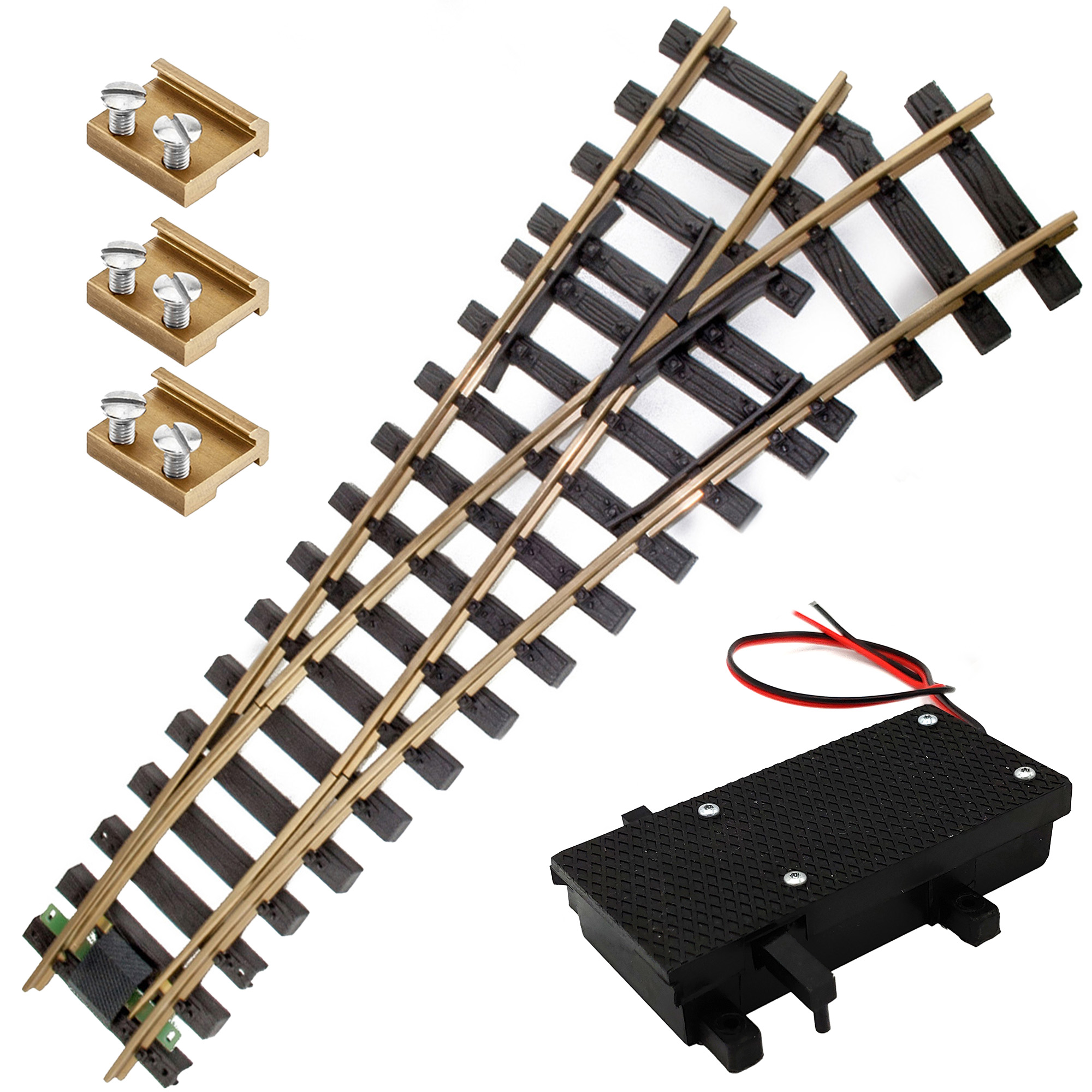 Set mit rechter Messing-Weiche (R3 / 120 cm) inklusive 3 Schraubverbindern sowie wetterfestem Weichenantrieb ML-Train 84012010 mit Herzstückrelais und kräftigem Metallgetriebemotor. Ideal für analoge und digitale Spur-G-Anlagen.
