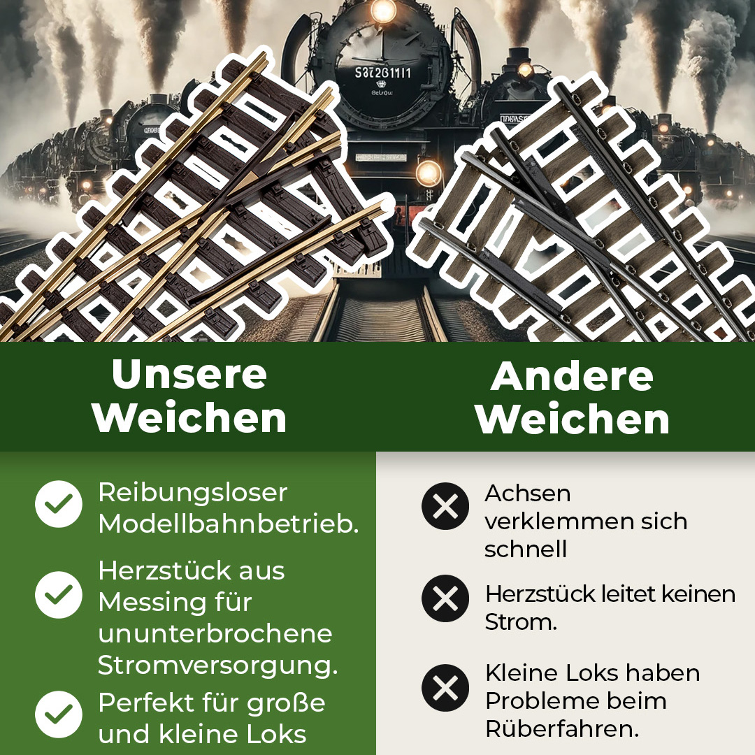 Die Weiche ist auf einen flüssigen und unterbrechungsfreien Fahrbetrieb ausgelegt. Ihre durchgängige Konstruktion unterstützt den Einsatz verschieden großer Lokomotiven und ermöglicht damit eine flexible Gestaltung des Gleisverlaufs. Gleichzeitig verringert sie mechanischen Verschleiß und schützt zuverlässig vor Achsblockaden – für eine dauerhaft stabile Nutzung bei geringem Wartungsaufwand.