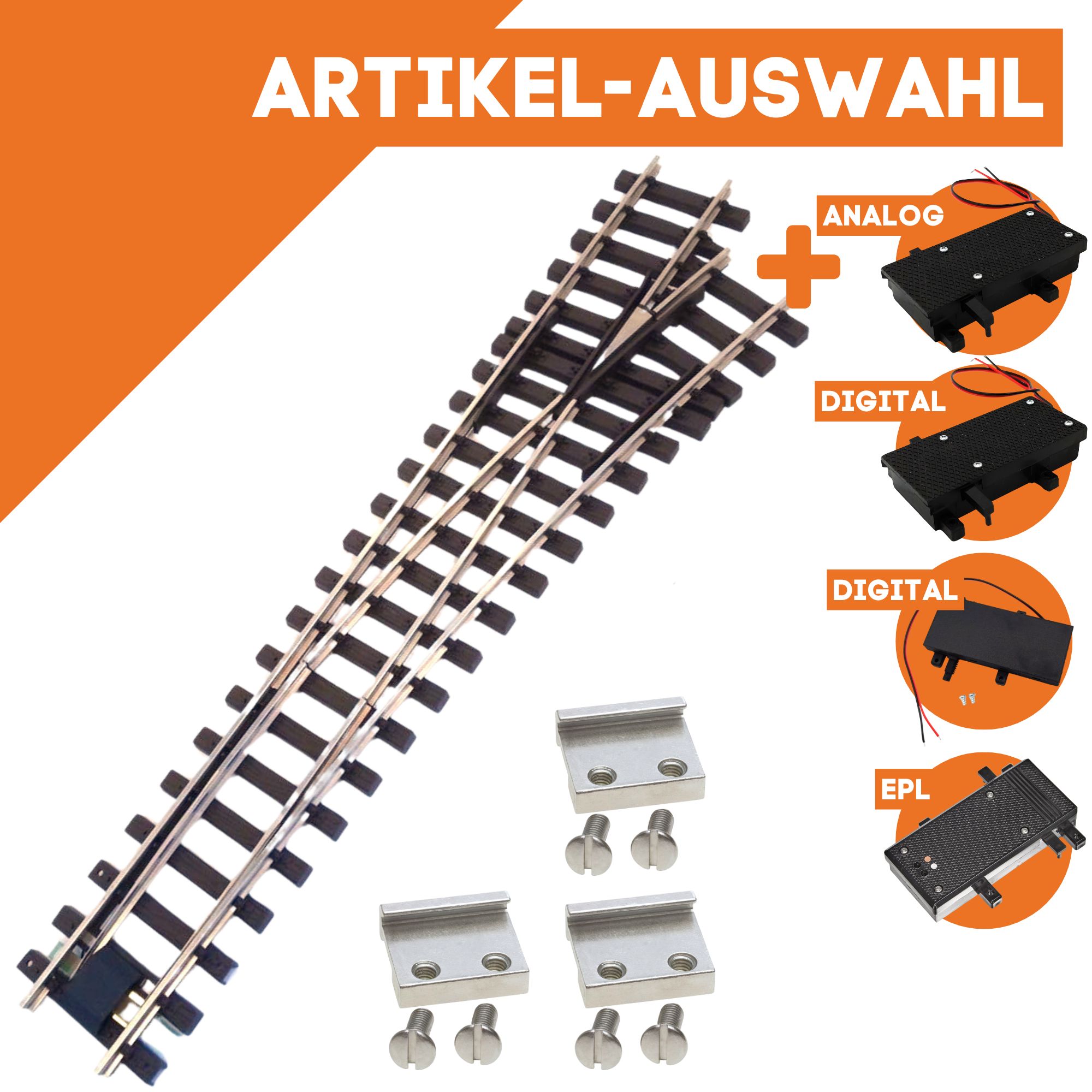 Auswahl rechts im Dropdown oder links über die Bilder. Grundweiche oder Sets mit Antrieb wählbar, identische Maße und Anschlüsse erlauben klar planbare Nachrüstungen und schnellen Austausch im Bestand. Radius R5 / 210 cm